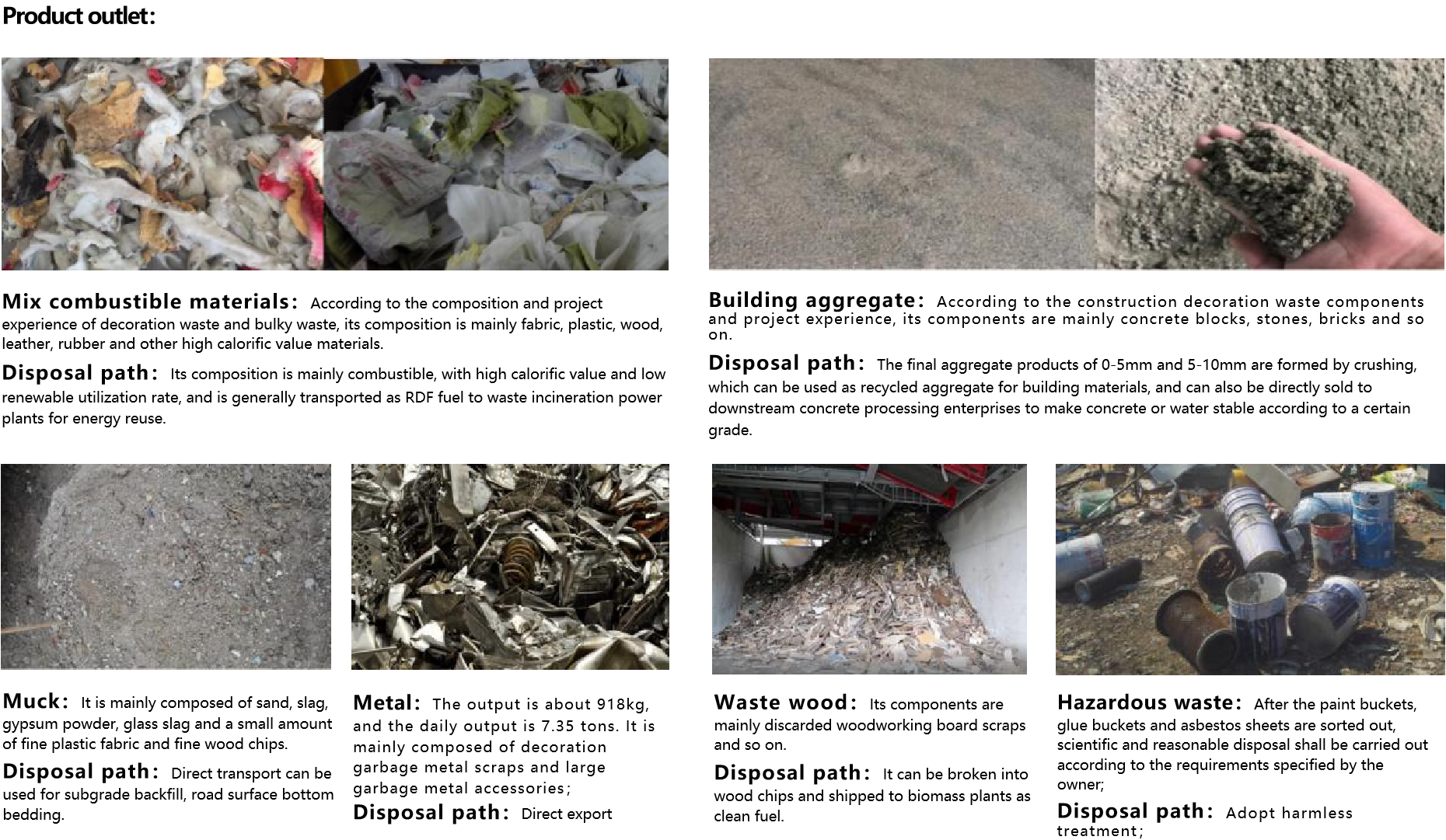 • Scale: Construction waste 600,000 tons/year, decoration waste 150,000 tons/year, large waste 15,000 tons/year, recycled bricks 580,000 square meters/year three-line collaborative resource disposal.