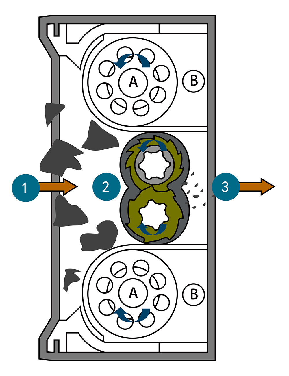 Two opposite rotating axes cause particles to be crushed between the two axes;